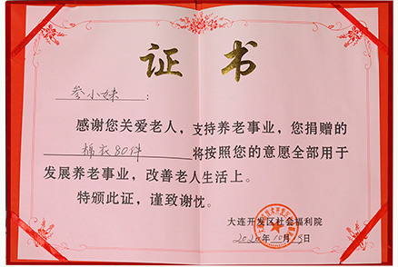 2020年获得大连开发区社会福利院颁发的公益证书,长期致力于为弱势群体提供支持和帮助