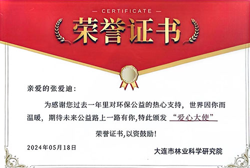 2024年获得大连市林业科学研究院授予的爱心大使证书,并担任悦童年研学基地宣传大使